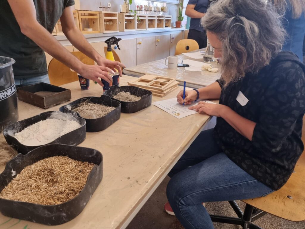 The first workshop was coordinated by Viltė Adomavičiūtė (Lithuania), biomaterials researcher at the New European Bauhaus Center – Vilnius Academy of Arts. The focus was on hemp as a structural base material, combining traditional processing techniques with contemporary construction applications. Participants worked with hemp fiber and shives, experimented with hempcrete, and tested pressing, pigmentation and casting methods using molds developed on site.